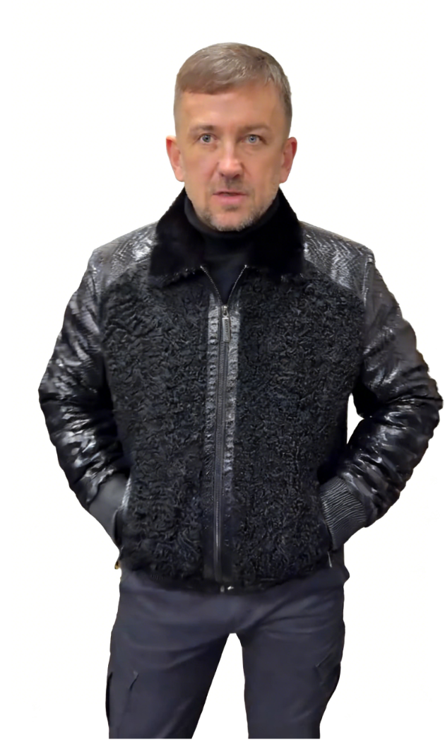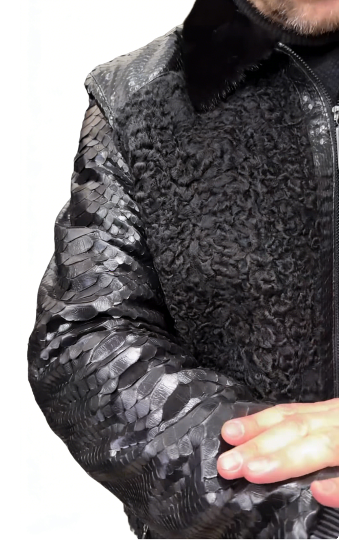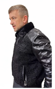 A black sheepskin and patent leather bomber jacket elevates a sophisticated casual look with its luxurious texture contrast and timelessly refined edges.
