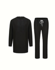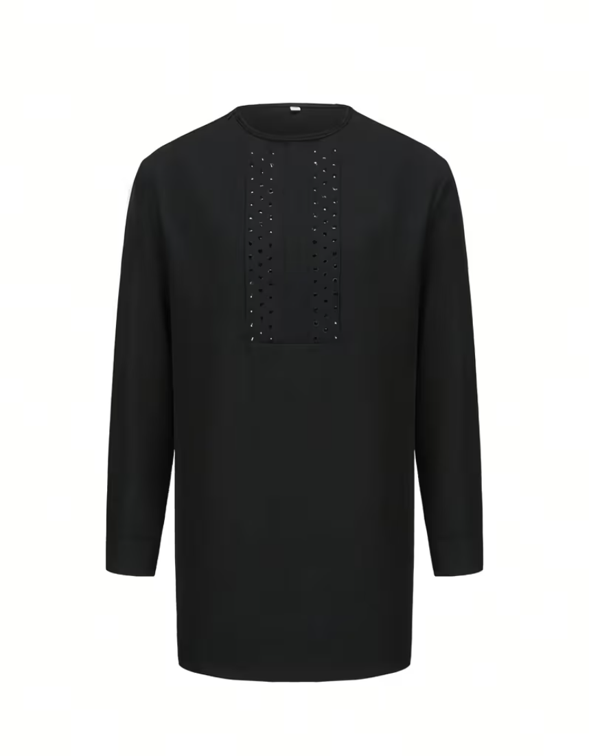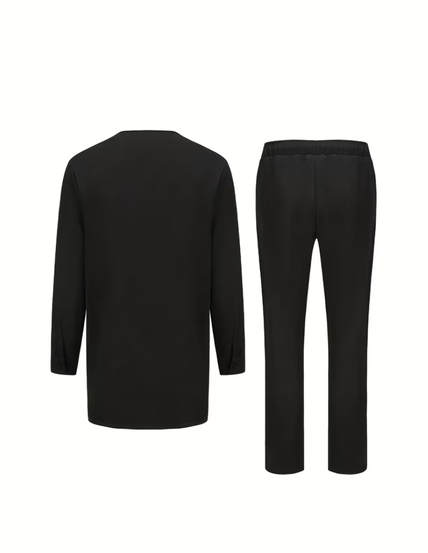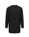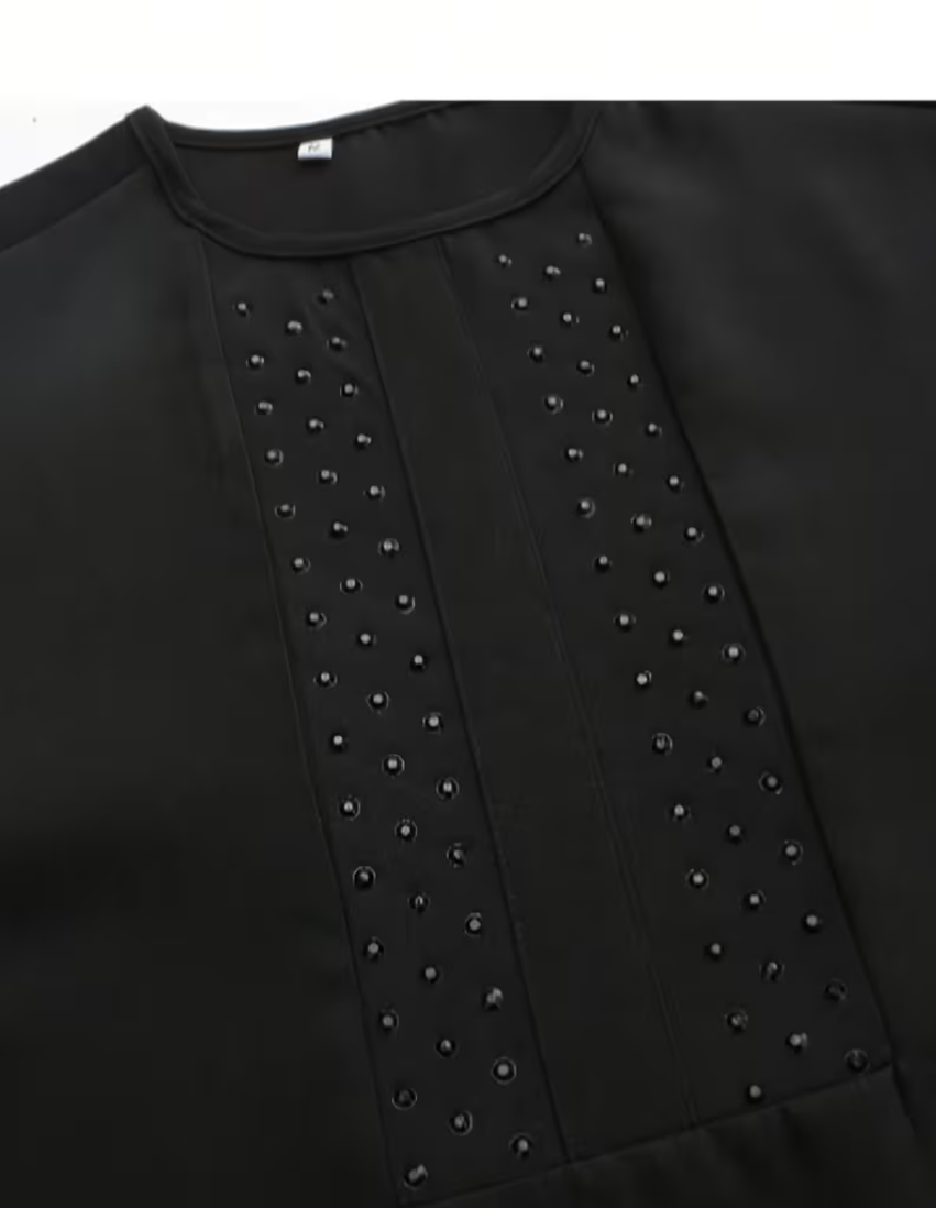 This black studded suit helps you effortlessly create a modern, casual look. Made from smooth black fabric, the suit includes a long-sleeved, belted top with a subtle, delicate studded pattern on the chest, paired with loose-fitting drawstring trousers. The perfect blend of comfort and minimalist style makes it suitable for casual outings, semi-formal parties, or everyday wear, helping you exude elegance. Wear this versatile suit to showcase your understated charm and shine with confidence!