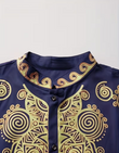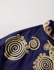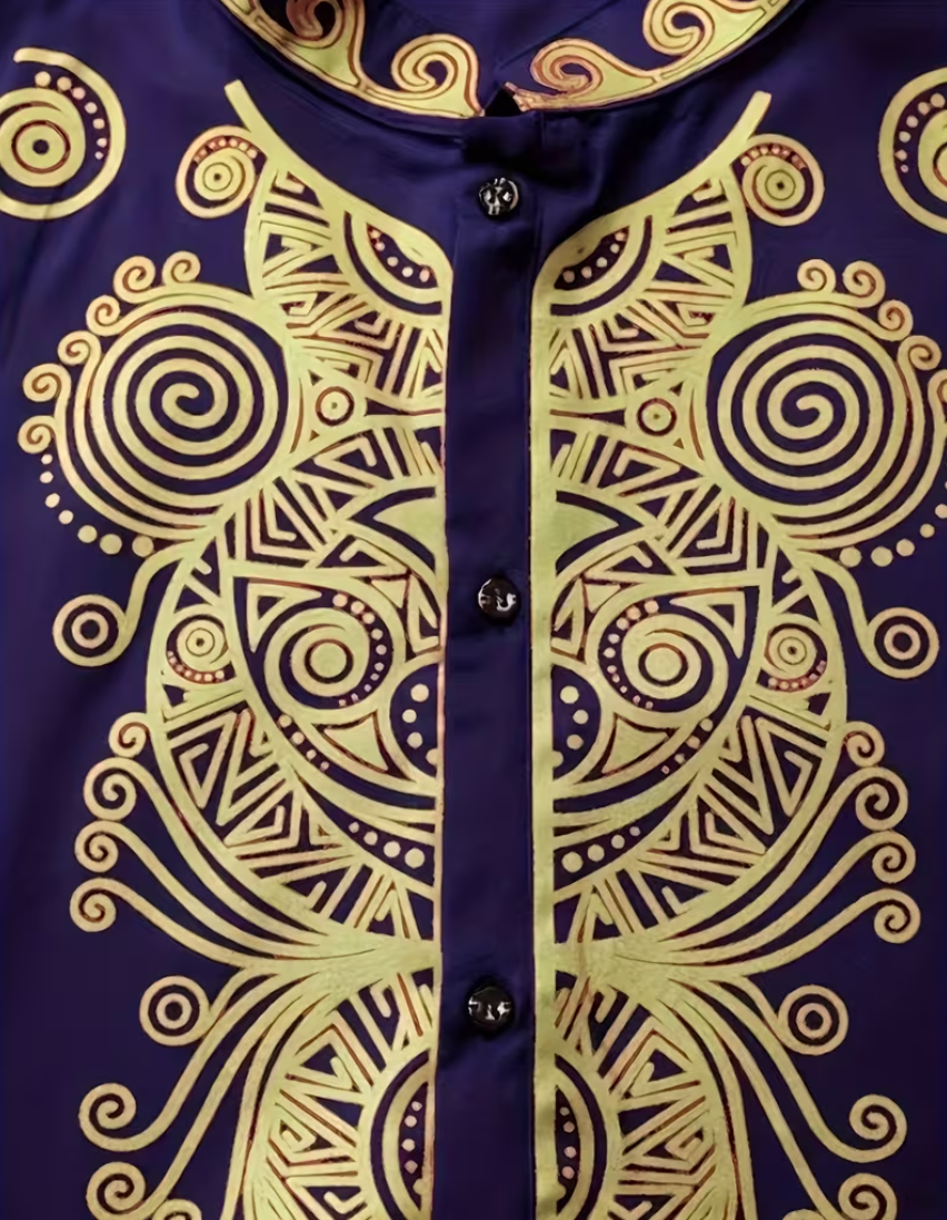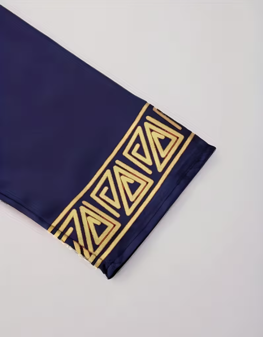 This royal blue and gold embroidered suit will add a touch of brilliance to your cultural event attire. Crafted from a noble and elegant royal blue fabric, the suit is adorned with exquisite gold tribal-style embroidery (including swirls and geometric patterns), perfectly blending vibrant color with traditional craftsmanship. It's suitable for weddings, cultural celebrations, or upscale gatherings. The comfortable cut and eye-catching design complement each other, allowing you to shine with confidence and showcase timeless cultural heritage. Enjoy the bold colors and exquisite craftsmanship of this striking suit!