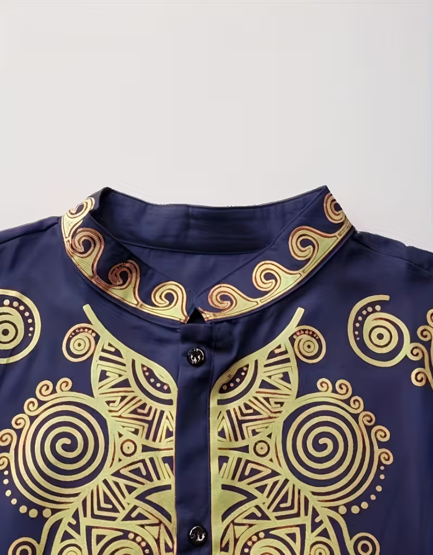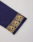Color: Royal blue, adorned with gold tribal-style embroidery