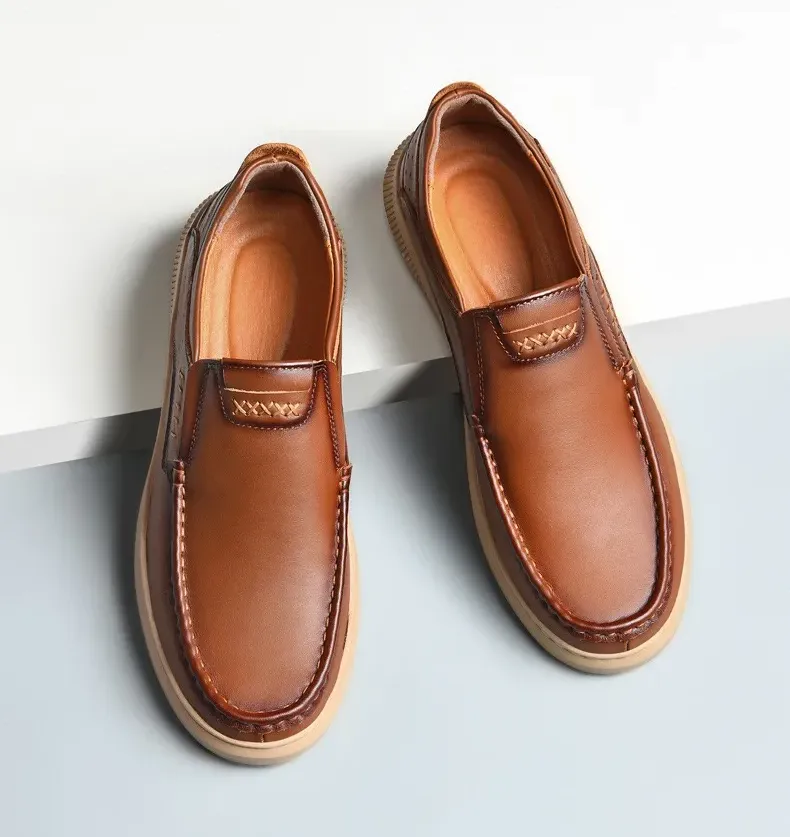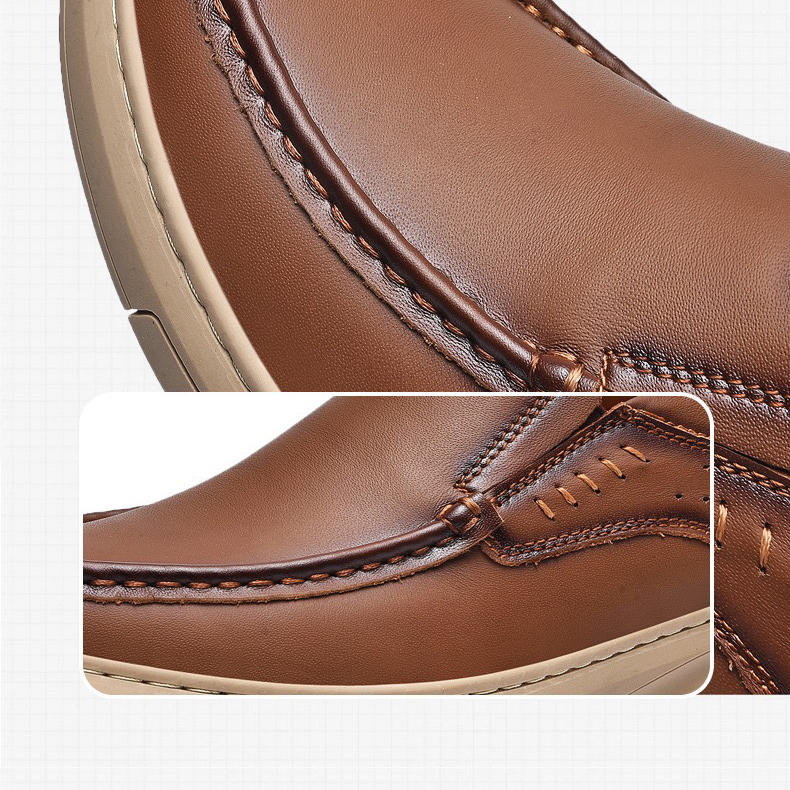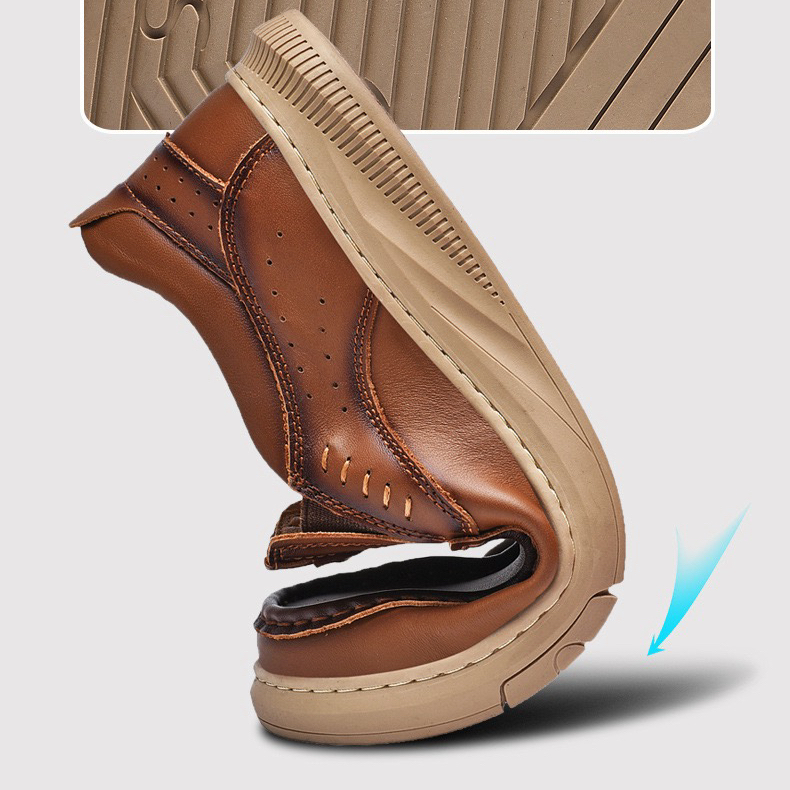 Crafted with a cow leather upper and breathable perforated design, these slip-on shoes keep your feet cool and dry. The flexible elastic opening ensures an easy fit while providing a secure, comfortable feel. The durable rubber outsole offers excellent cushioning, absorbing shock with each step. Paired with breathable, shock-absorbing insoles, they provide all-day comfort and support, making them perfect for work, travel, or even as home slippers. Ideal for any occasion or terrain.