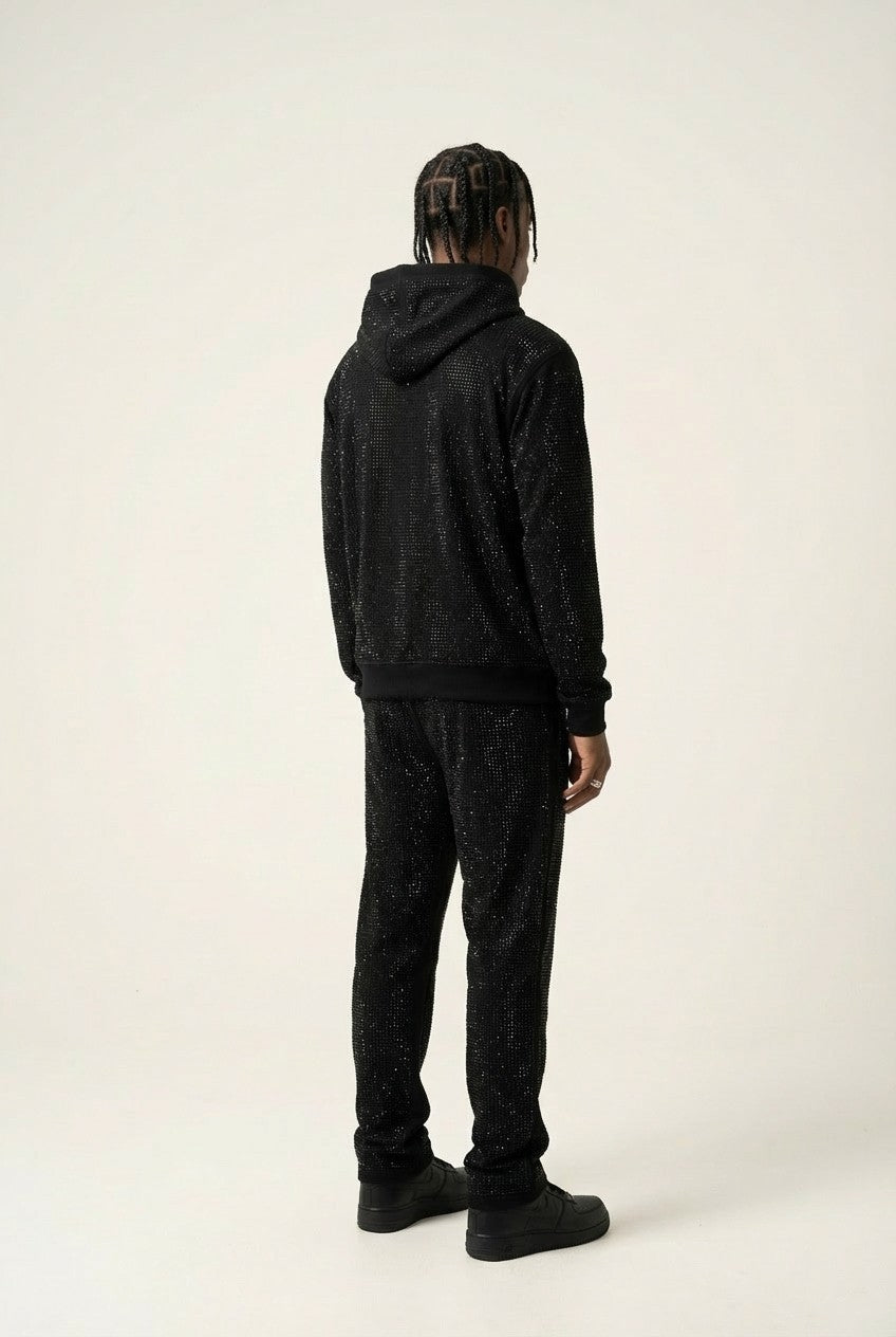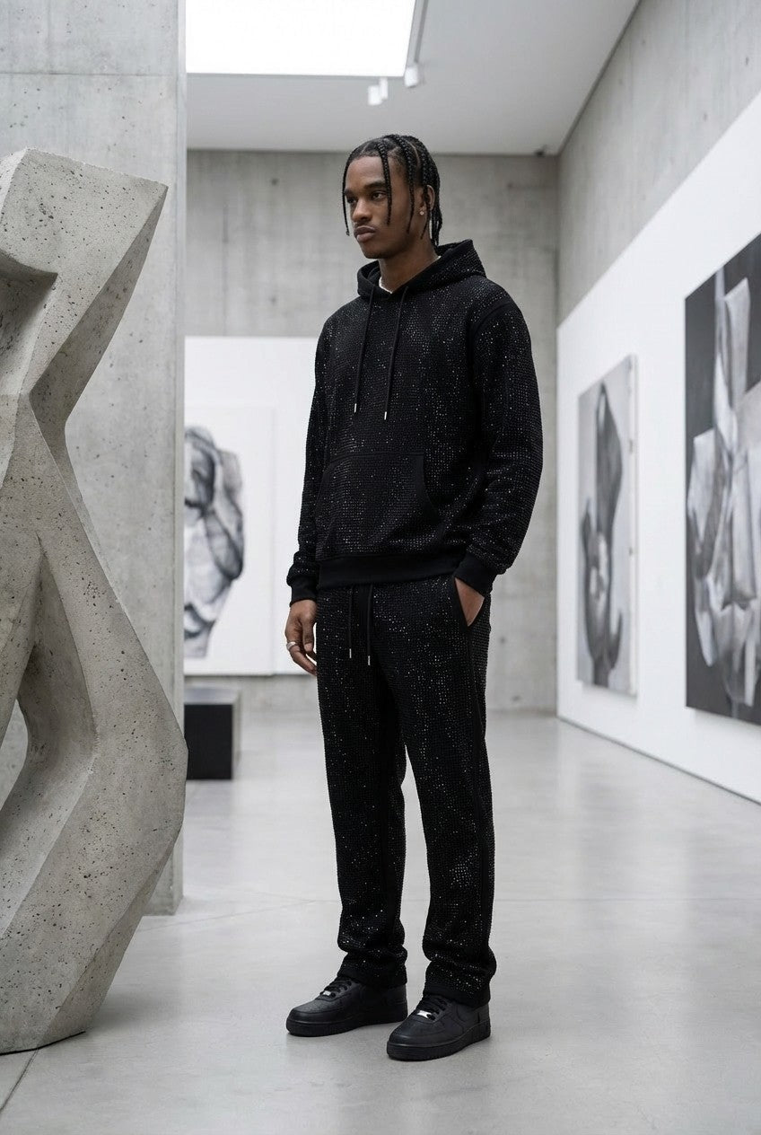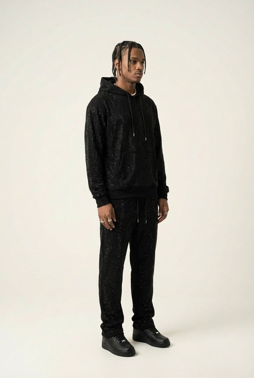 Redefine luxury streetwear with this statement piece. Designed to catch the light from every angle, this all-over rhinestone set blends high-end aesthetics with unparalleled urban comfort.