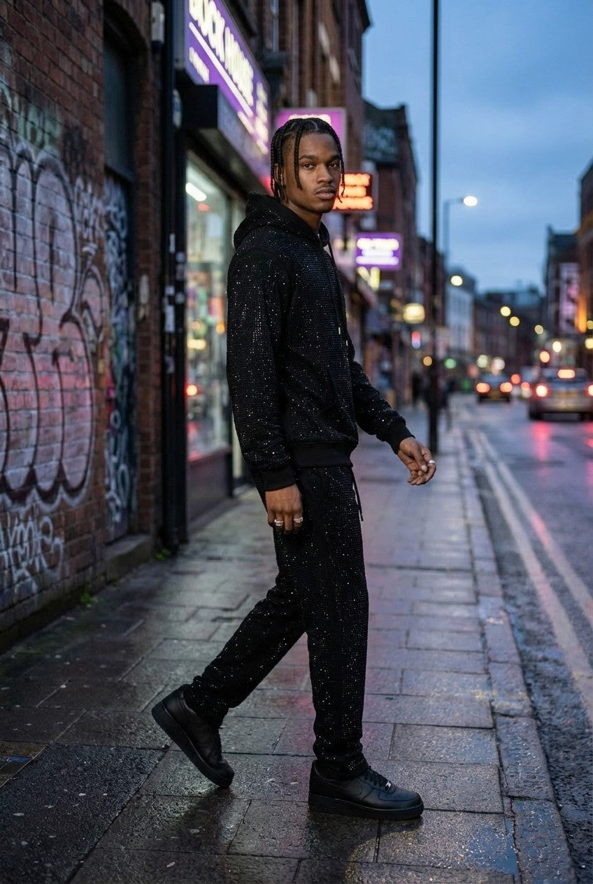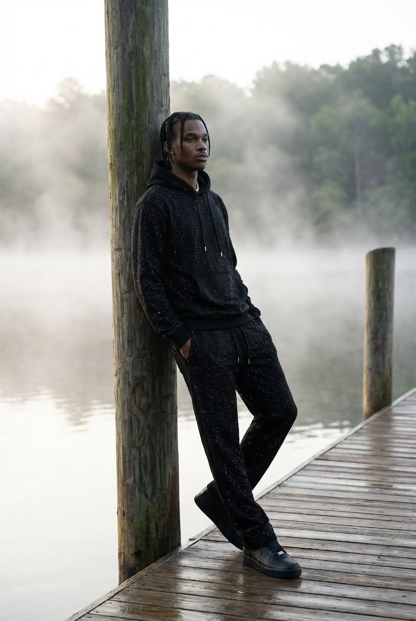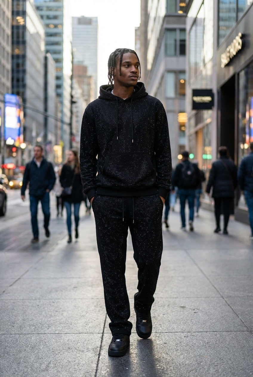 Redefine luxury streetwear with this statement piece. Designed to catch the light from every angle, this all-over rhinestone set blends high-end aesthetics with unparalleled urban comfort.